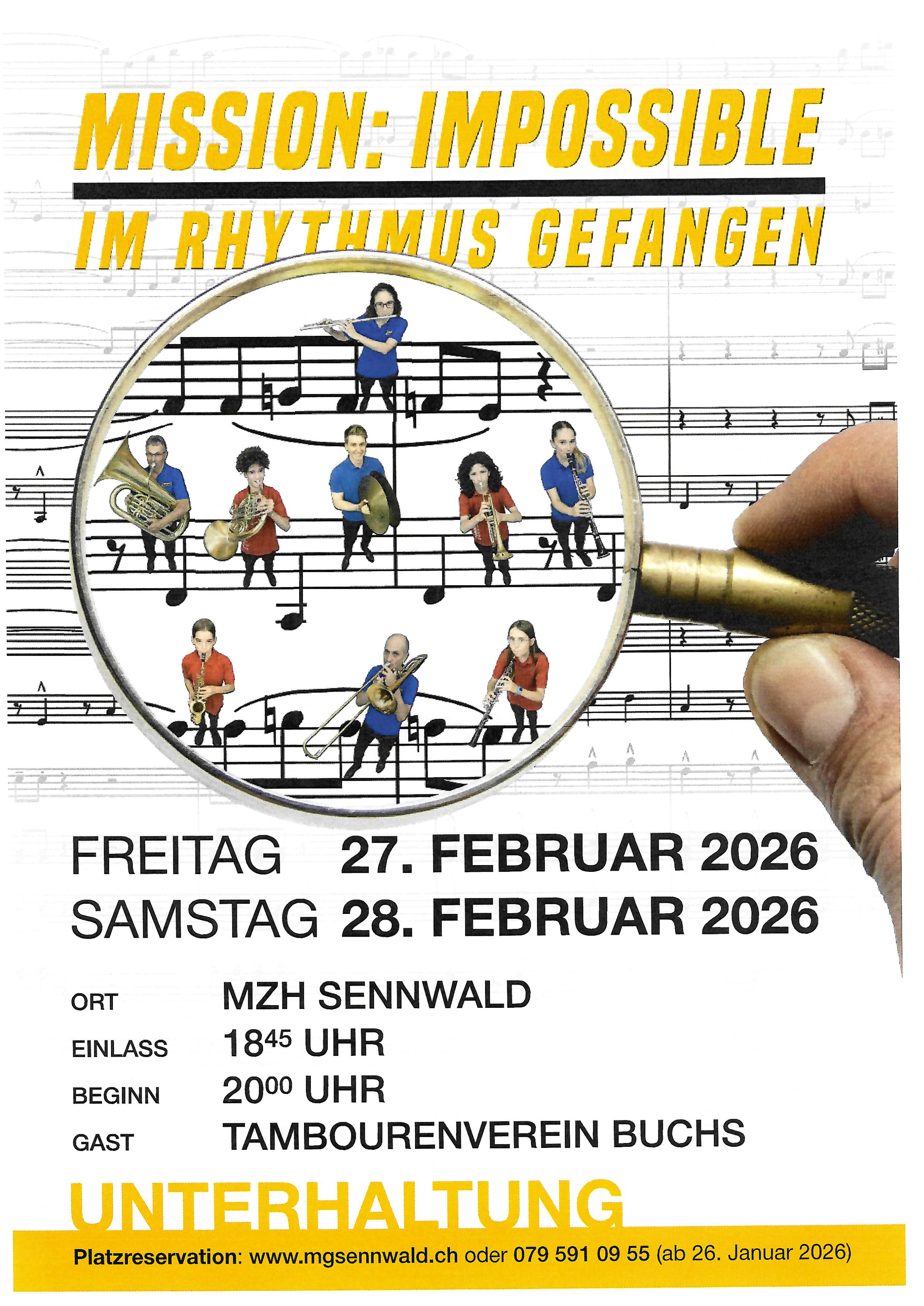 Unterhaltungsabend der Musikgesellschaft Sennwald zusammen mit der Jugendmusik Sennwald und den Youngsters sowie dem Gastauftritt des Tambourenvereins Buchs. Festwirtschaft ab 18:45.